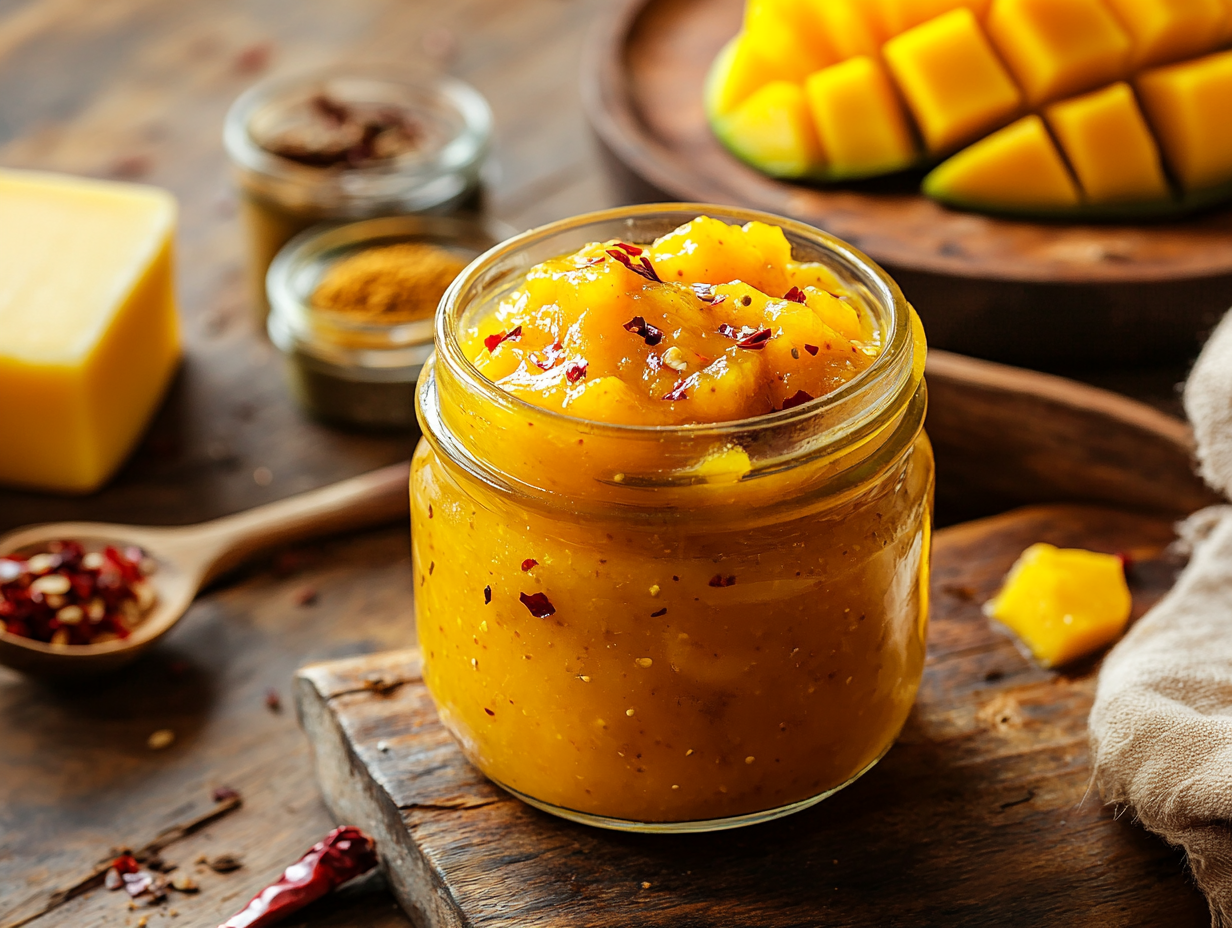 One key aspect of this recipe is its spice blend. The inclusion of mustard seeds provides a nutty, earthy undertone, while grated ginger enhances the chutney with its warm, zesty kick. Red chili flakes add varying levels of heat depending on your preference, delivering a fiery undertone that cuts through the richness of the mango. Apple cider vinegar plays a pivotal role as well, contributing acidity that balances out the sweetness from the fruit and sugar. Together, these components create a harmonious flavor profile that is equal parts comforting and bold.
