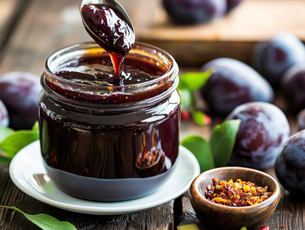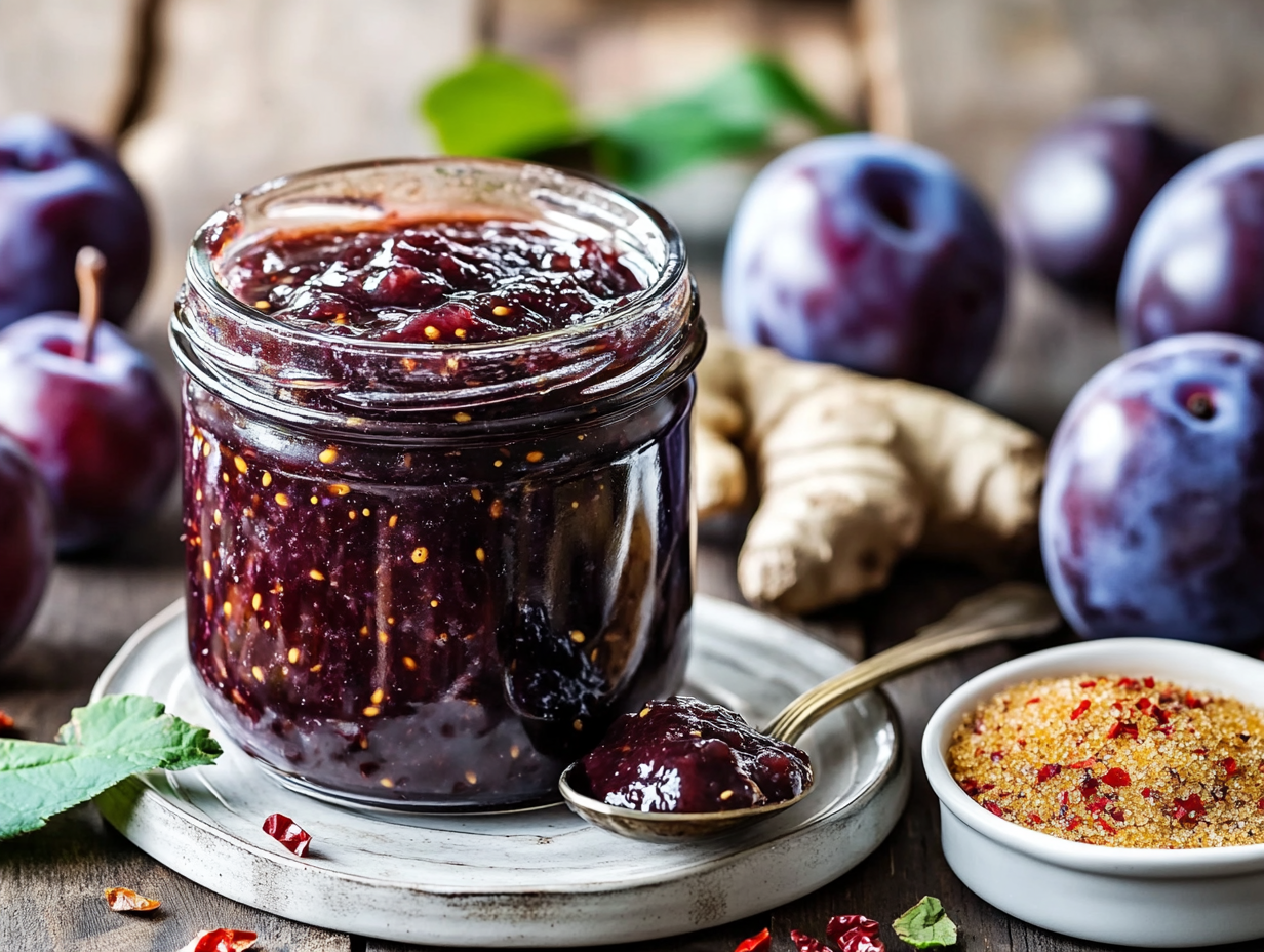Plum sauce has a special place in kitchens around the world, especially in Asian cuisines, where plums have long been used to impart sweet, sour, and deeply fruity tones to a wide array of sauces. The version of plum sauce you see here brings together the classic elements—ripe, juicy plums, tangy vinegar, and aromatic seasonings—and merges them into a balanced, versatile sauce. It resonates with many layers of flavor: the natural sweetness of the fruit, the zing of ginger, and a gentle heat from chili flakes. This combination makes it a delightful choice for pairing with rich, savory meats, delicate dumplings, or even crisp vegetables.