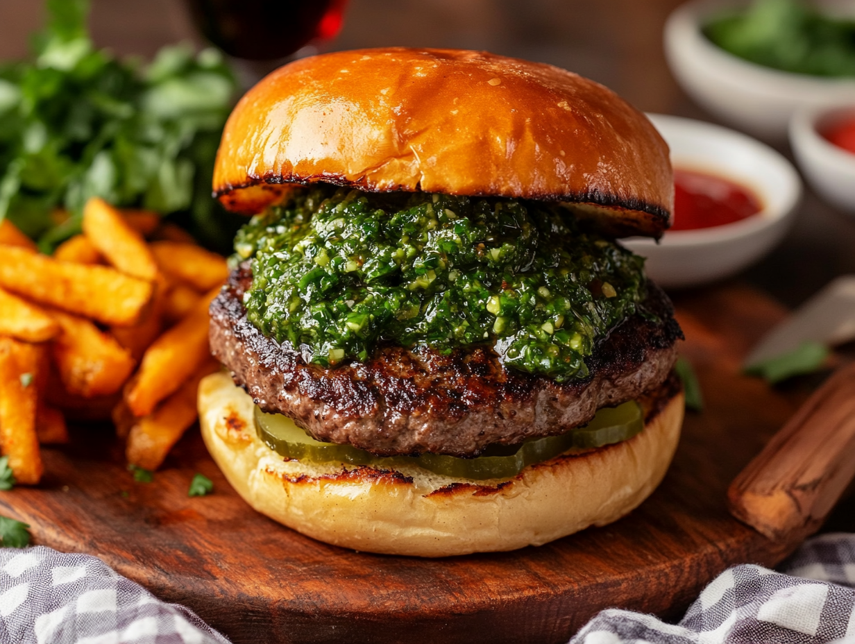 Chimichurri has its roots deeply entrenched in Argentine and Uruguayan cooking, where it’s a quintessential accompaniment for asado, the South American barbeque tradition. This sauce, made with fresh parsley, oregano, garlic, olive oil, and a hint of red wine vinegar, is as versatile as it is flavorful. It’s bright, tangy, and slightly garlicky, providing a refreshing yet robust complement to the richness of grilled beef. By incorporating this golden culinary hallmark into a burger, the Chimichurri Steak Burger bridges worlds, transforming a casual comfort food into a gourmet experience.