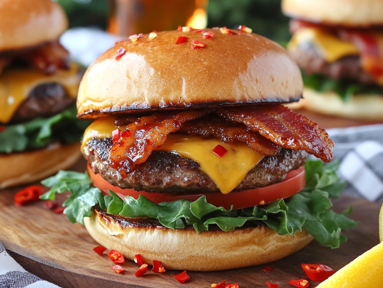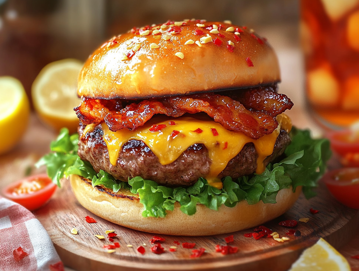 The Spicy Maple Bacon Burger is a mouthwatering creation that embodies bold flavors, texture contrasts, and sheer indulgence. This recipe is a celebration of American comfort food with a twist, combining the smoky, meaty essence of a classic burger with sweet and spicy notes that elevate it to gourmet status. It was born from a desire to blend the timeless appeal of burgers with the adventurous pairing of sweet maple syrup and a warm kick of chili flakes, resulting in a burger that surprises and delights the taste buds with every bite.