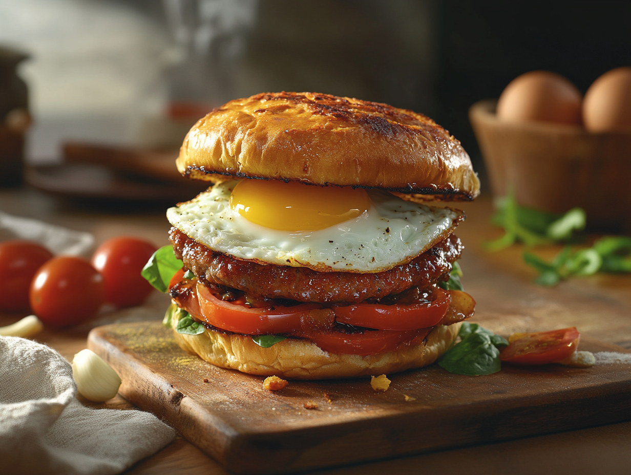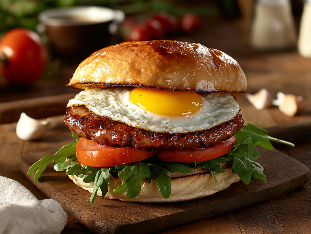 - Assemble the burger by placing the pork patty on the bottom half of the toasted brioche bun, followed by the fried egg, tomato slices, and mixed greens. Cover with the top bun and press gently to hold together.