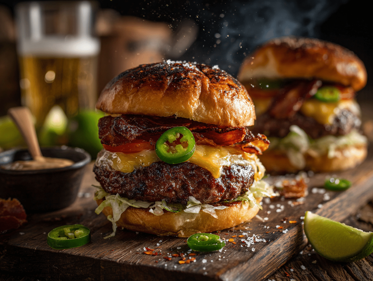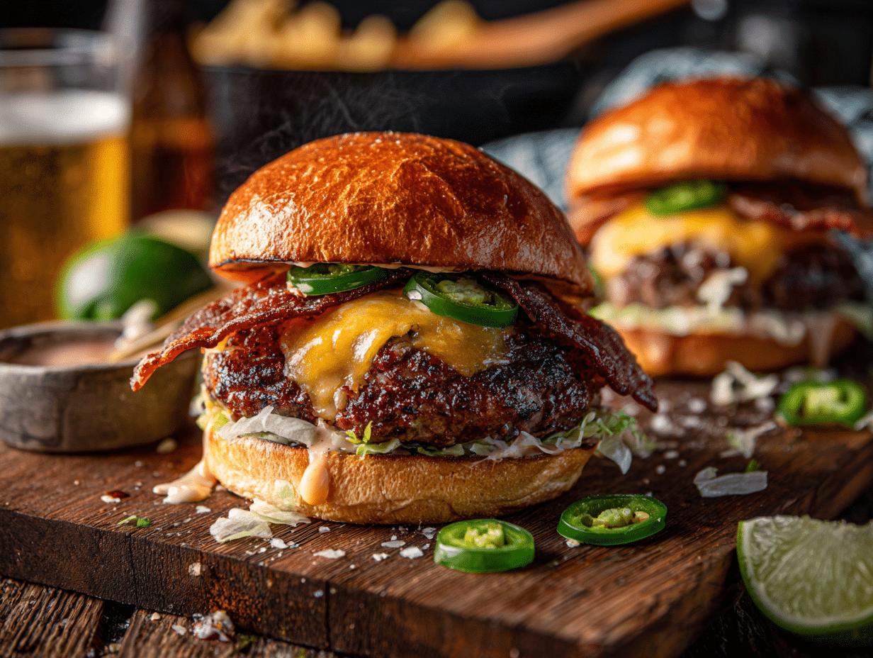 - Serve: The burger should look glossy with melted cheese, vibrant green jalapeños, and a golden toasted bun. You should smell smoke, spice, and warm garlic-chile aroma from the sauce.