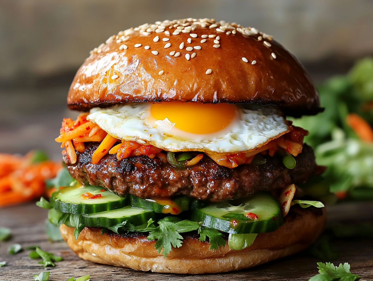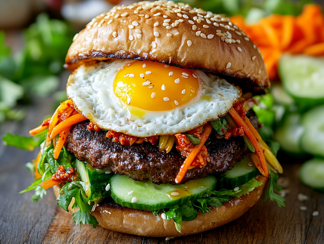 - Assemble the Burger: Toast the burger buns lightly. Spread gochujang sauce on the bottom bun, add the cooked patty, then layer with kimchi, bean sprouts, julienned carrots, cucumber slices, and a fried egg. Sprinkle with sesame seeds.