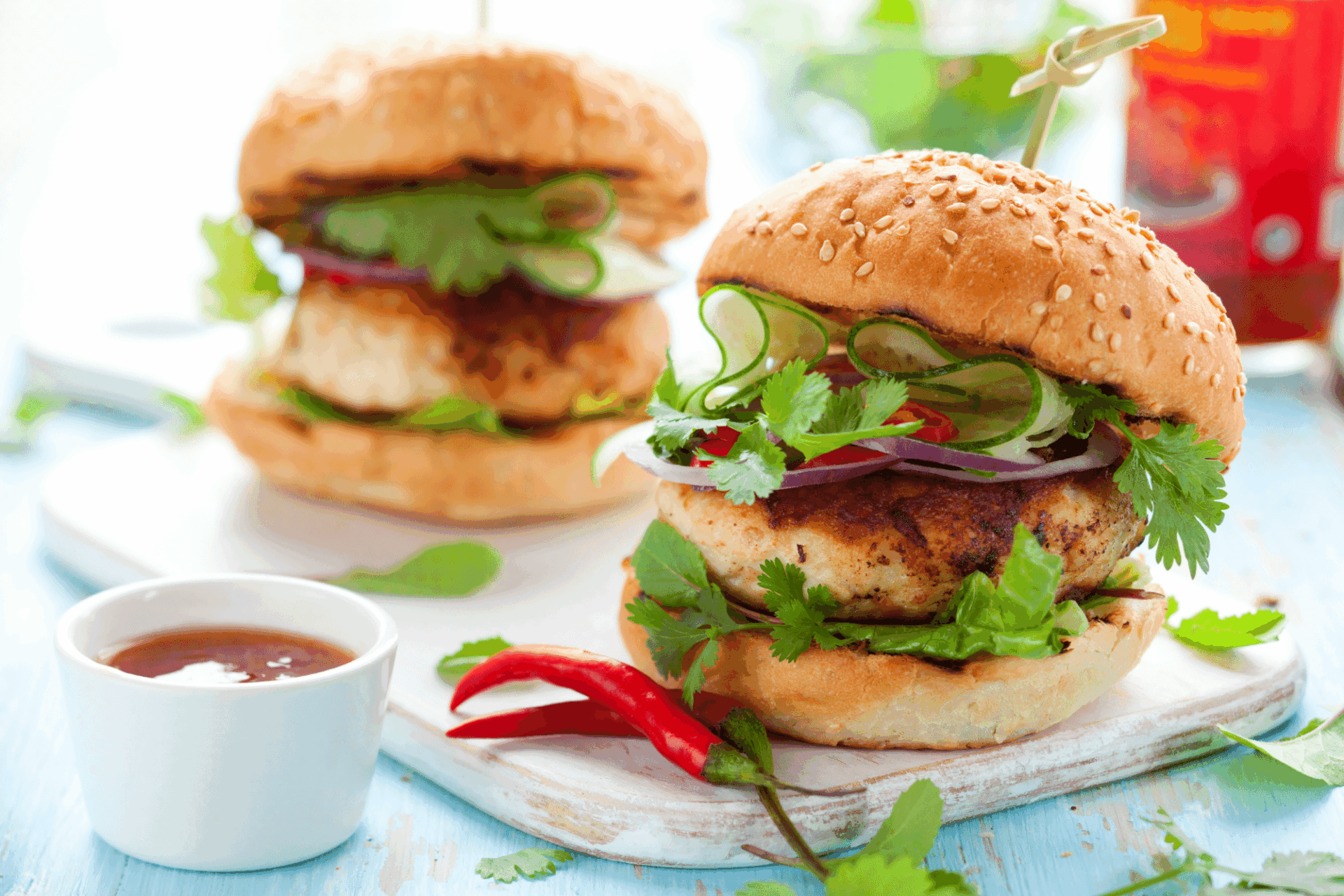 These Thai chicken burgers are smeared with peanut butter. This is a very satisfying meal to have when craving something salty and savoury.