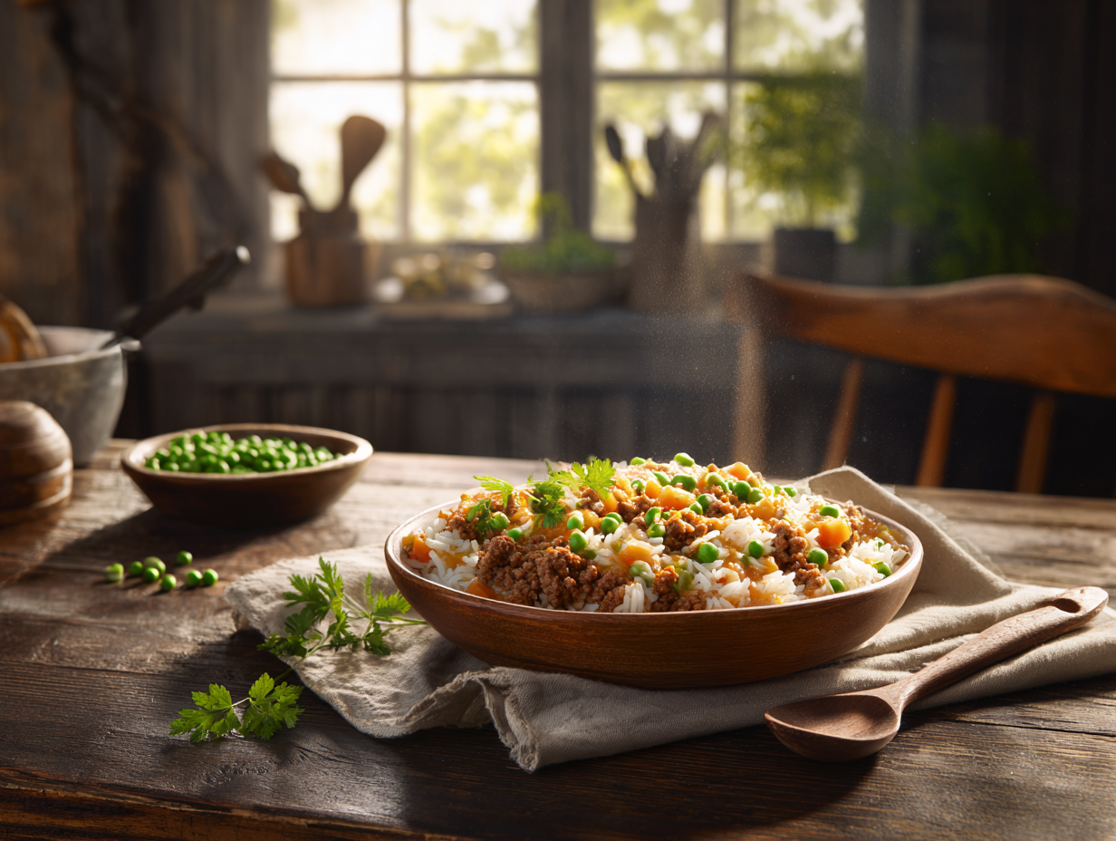 Vegetables like carrots and peas are integrated directly into the mix, eliminating the need for separate sides and adding a pop of color, texture, and nutrition. The carrots cook alongside the rice under pressure, becoming tender and sweet, while the peas are stirred in at the end to retain their bright green color and freshness. This balance of protein, grains, and vegetables makes the dish not only delicious but nutritionally balanced.