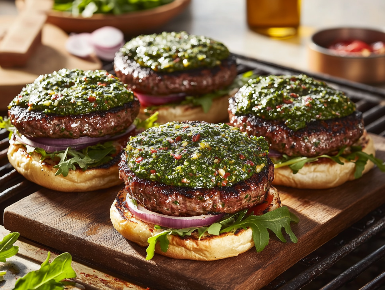 - Assemble the burger by layering arugula on the bottom half of each bun, followed by a cheese-covered patty, a generous spoonful of chimichurri sauce, and thin slices of red onion. Finish with the top bun and serve immediately.