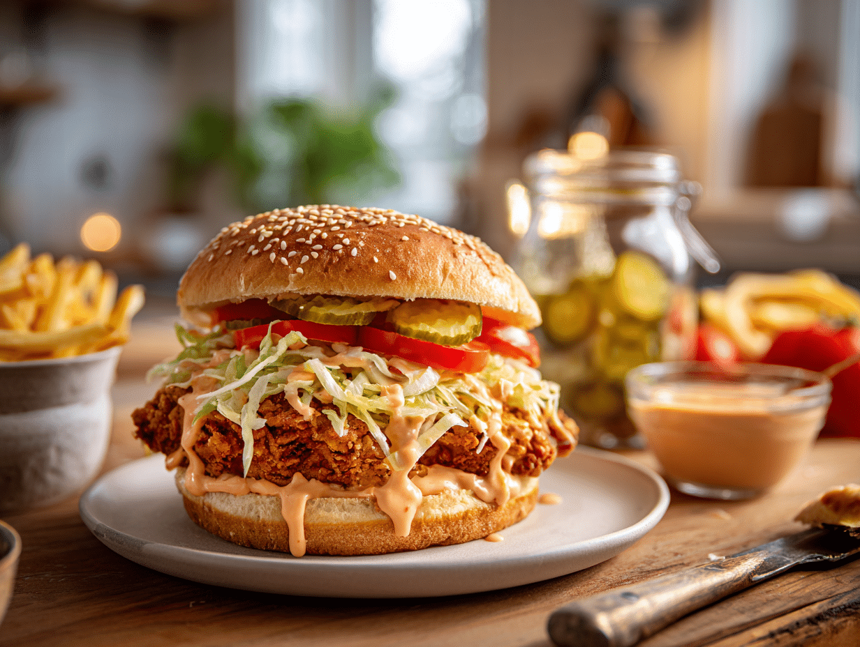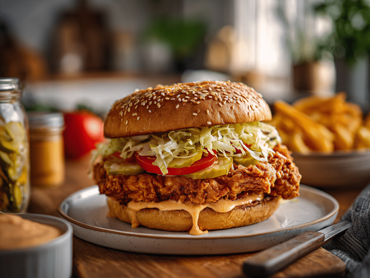 - Rest Briefly and Serve: Let the sandwich sit 1–2 minutes so the juices settle and the bun warms from the chicken. Serve immediately while the crust crackles.