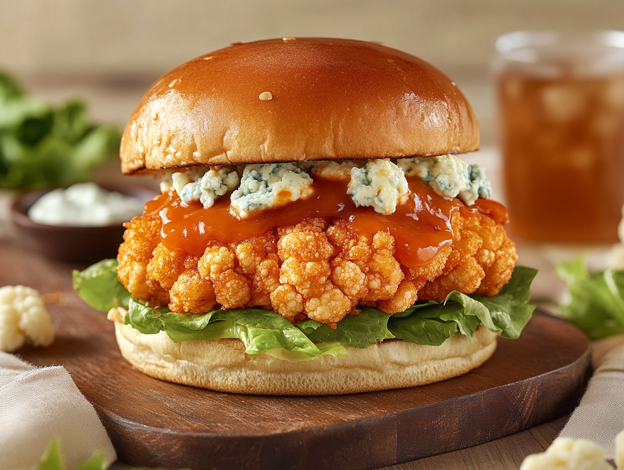 Drawing heavily from American comfort food culture, buffalo sauce was chosen as the flavor foundation for this burger. Known for its iconic combination of spicy, tangy, and buttery flavors, buffalo sauce traditionally accompanies fried chicken wings. However, this recipe challenges the norm by incorporating it into a vegetarian main course, proving that powerful flavors needn’t be exclusive to meat-based dishes. The cauliflower florets, coated in a spiced batter and crispy bread crumbs, absorb the sauce beautifully, becoming irresistibly flavorful while maintaining a satisfying crunch.
