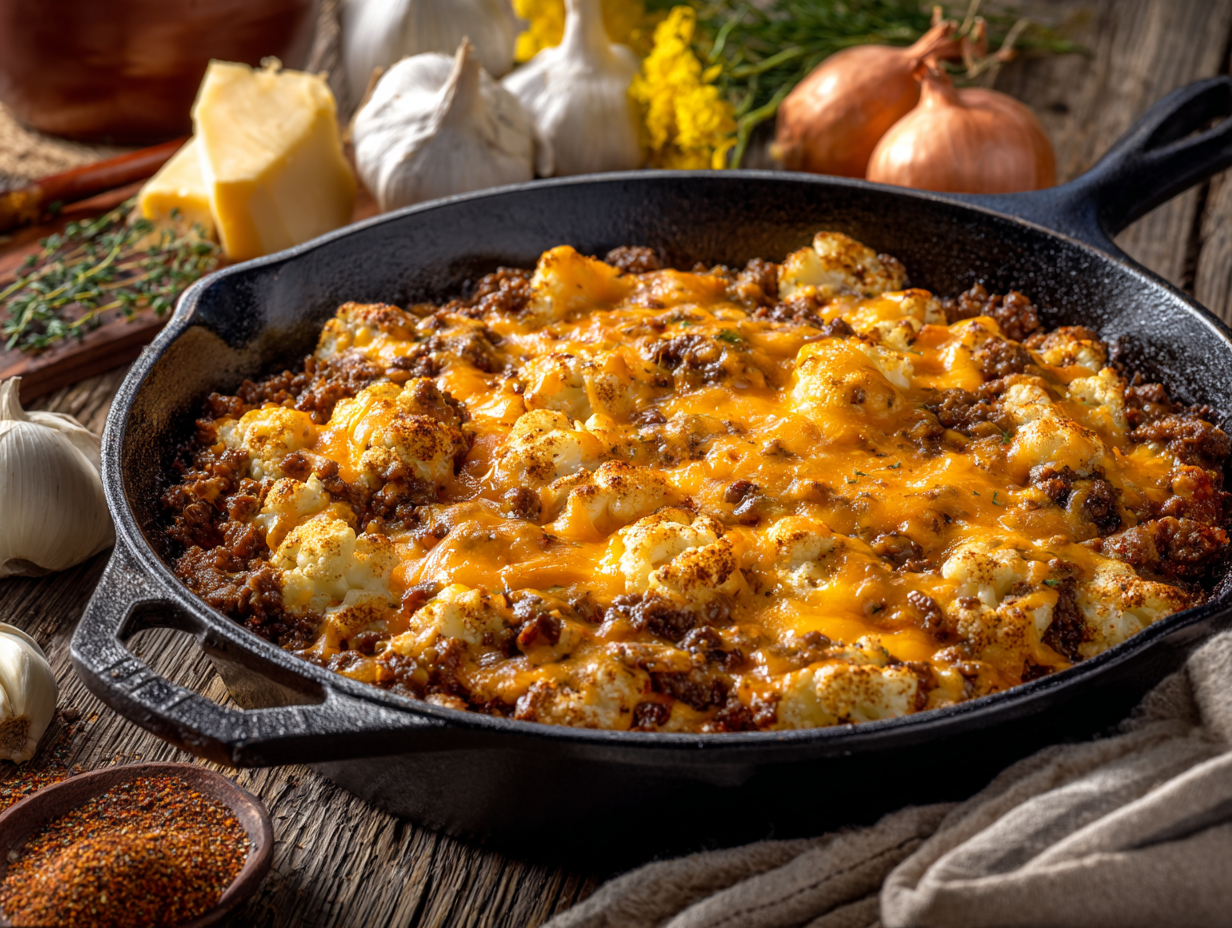Once the beef is browned and the cauliflower has softened to just the right consistency, the cheese layer comes into play — and let’s be honest, this is the crown jewel of the recipe. Sharp cheddar is preferred for its bold flavor, and it effortlessly ties all the ingredients together. The addition of cream cheese and a touch of heavy cream not only boosts fat content (ideal for keto) but also creates an irresistibly creamy, velvety texture that coats every bite.