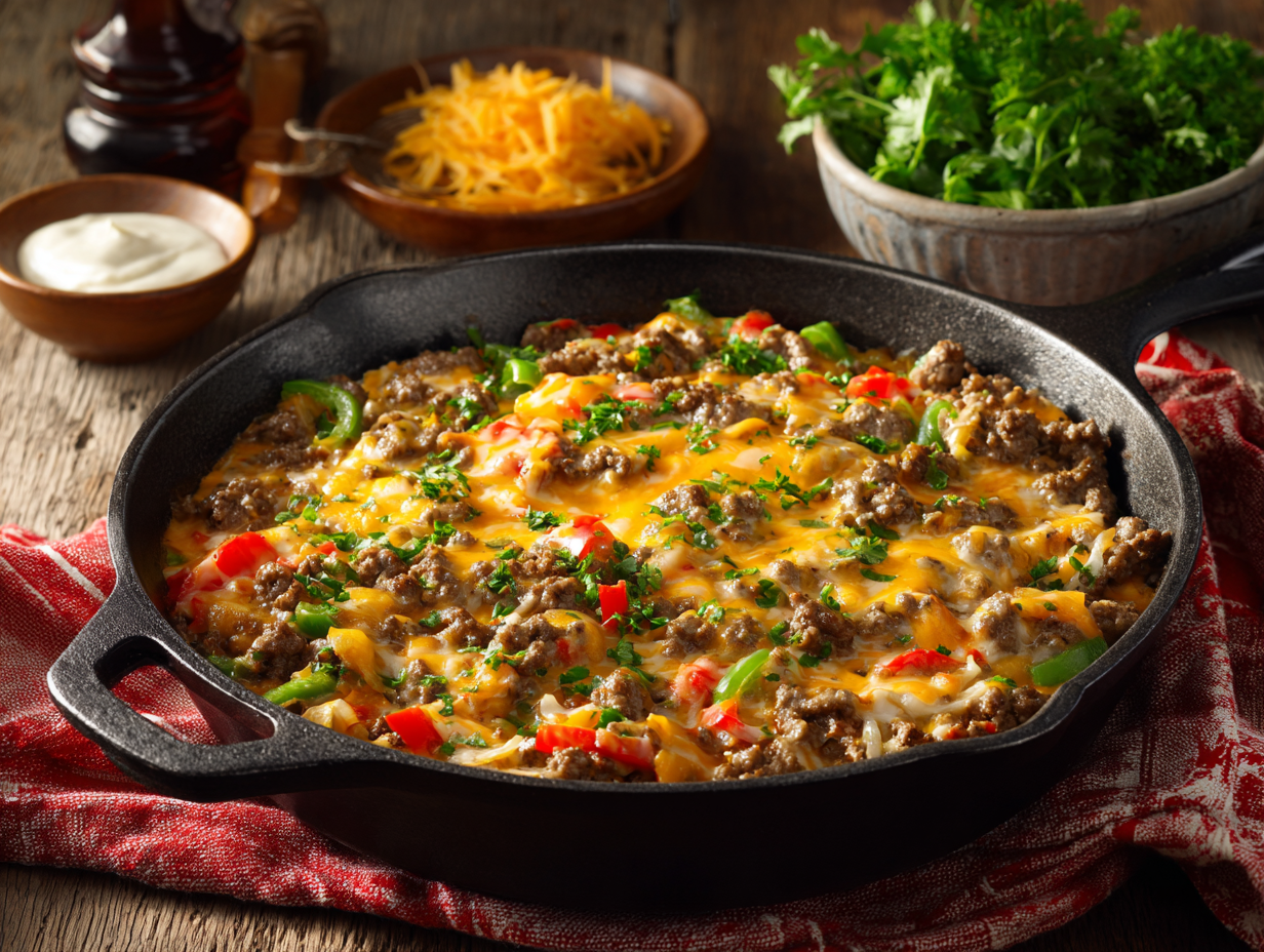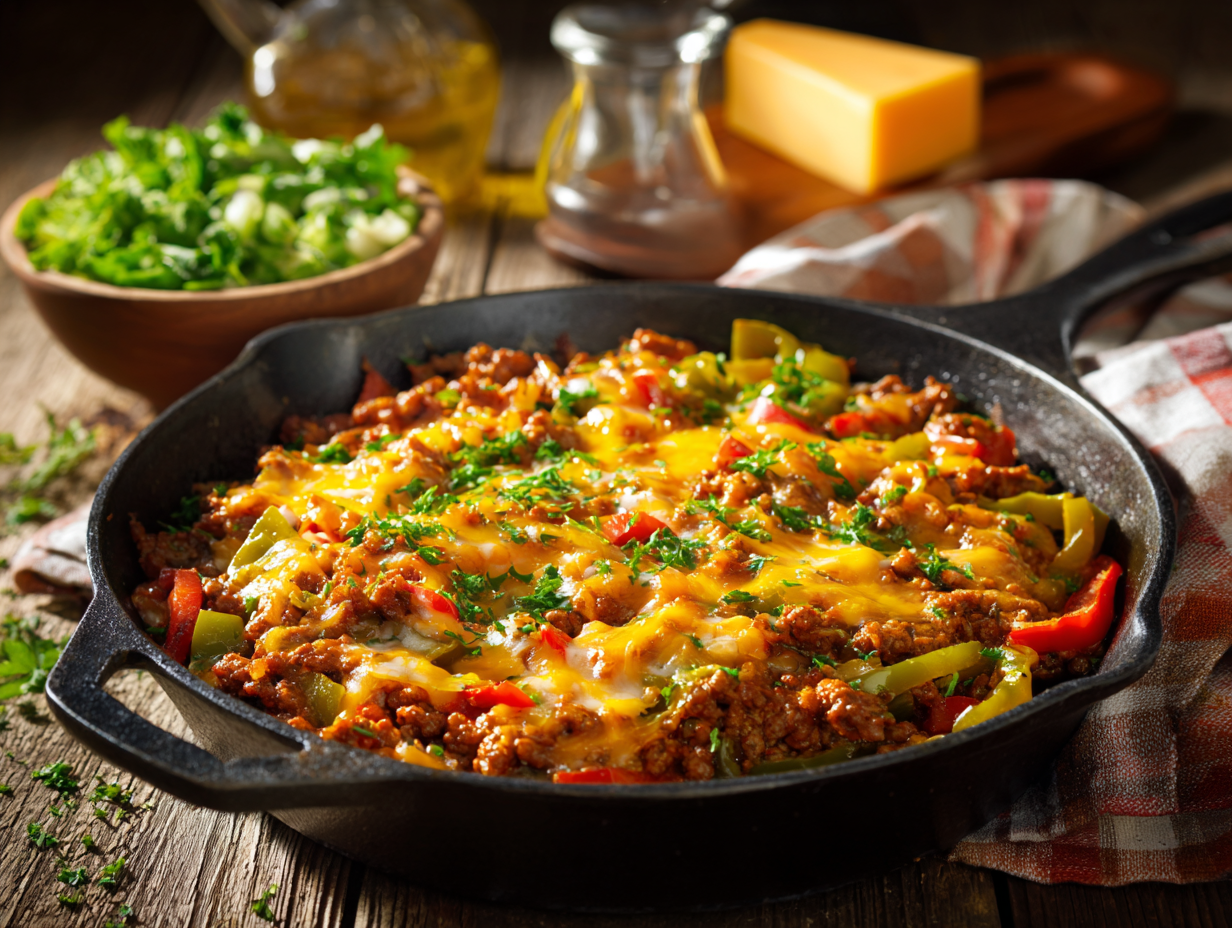 This skillet meal is more than just a practical dinner solution; it’s a culinary evolution shaped by dietary awareness, busy lifestyles, and a desire to reconnect with satisfying flavors in a healthy way. At its core, this dish reflects the American spirit of adaptation—bringing together grounding ingredients like beef, cheese, onions, and peppers in a form that’s both simplified and health-conscious.