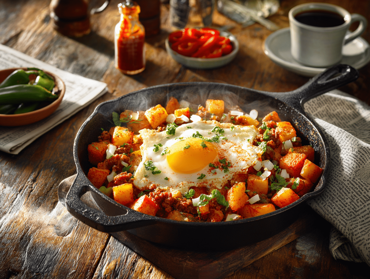 The inspiration for this dish stems from multiple cooking traditions that celebrate robust and hearty meals cooked together in a single pan. From Midwestern farmhouse breakfasts to New York City diners, skillet meals have served as reliable staples for generations of American cooks. Hashes in particular — mixtures of diced meat, potatoes, and onions — date back to the 17th century and gained popularity due to their affordability and flexibility. The term “hash” itself comes from the French word hacher, meaning “to chop,” and it perfectly describes the preparation method of the components in this recipe.