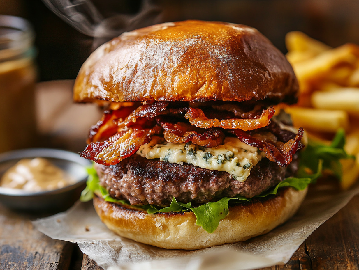 Stilton cheese plays a pivotal role in this burger’s distinct taste. This iconic English blue cheese has been produced since the early 18th century and is known for its tangy, creamy, and slightly crumbly texture. It is protected under PDO (Protected Designation of Origin) status, meaning authentic Stilton can only be produced in the counties of Derbyshire, Leicestershire, and Nottinghamshire. The bold, earthy taste of Stilton adds a layer of complexity to the burger, providing a sharp contrast to the savory beef and bacon.