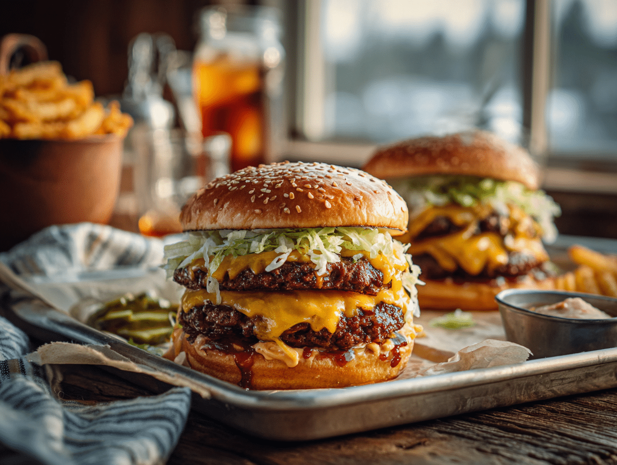 - Build the Big Hardee–Style Stack (2 minutes): Spread a generous spoon of sauce on both the heel (bottom bun) and crown (top bun). On the heel, layer shredded lettuce, pickles, and a sprinkle of onion. Add one cheesy patty, then the second cheesy patty. Spoon on a touch more sauce if desired. Cap with the crown.