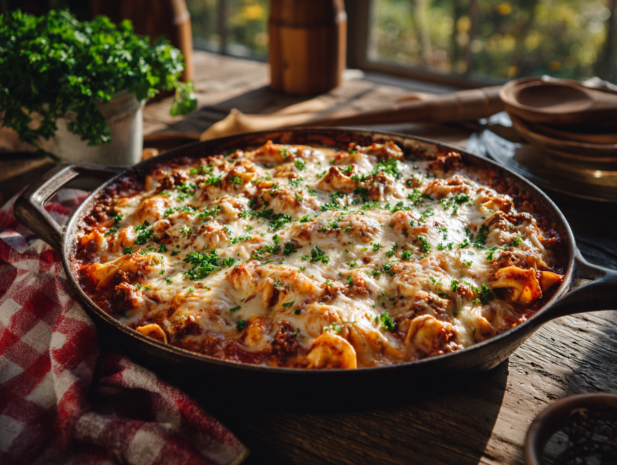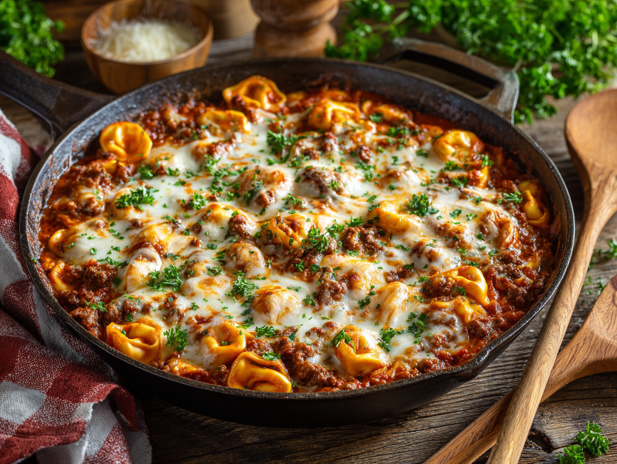 The Cheesy Hamburger Tortellini Skillet is more than just a satisfying, comfort-laden dish—it’s a reminder that good food can be both simple and deeply nostalgic. It is born out of the fusion of two iconic culinary traditions: the indulgent, flavor-forward soul of Midwestern American cooking and the timeless elegance of Italian pasta heritage. It brings together familiar flavors—from cheese-stuffed pasta to meaty marinara sauce—into a one-pan meal that satisfies the cravings for both nostalgia and novelty.