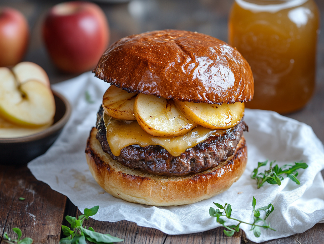 - Assemble the burgers by placing each patty with melted Gouda onto the bottom halves of the toasted brioche buns. Top each with a generous heap of the caramelized apples, cover with the top buns.