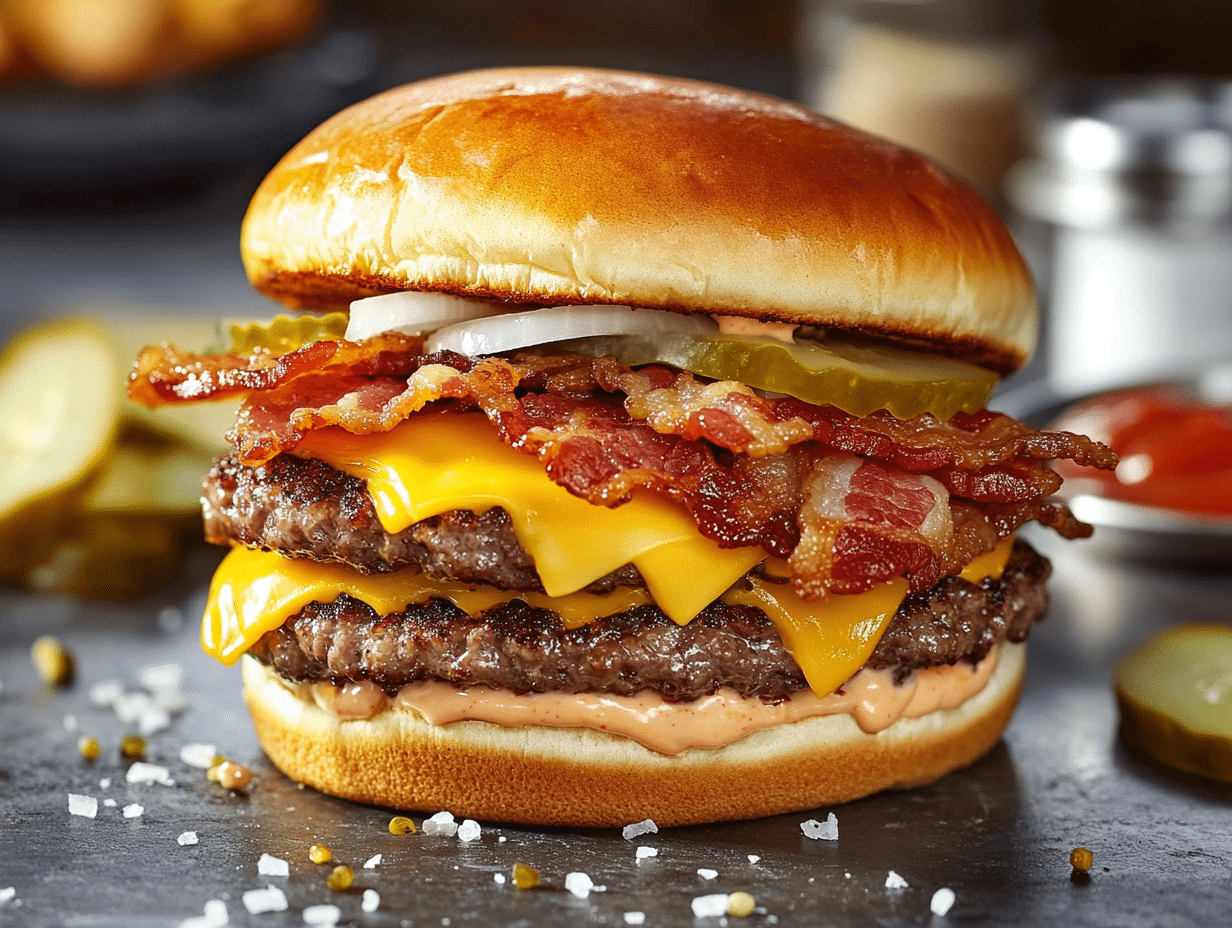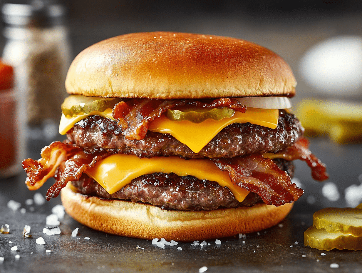 Then comes the real flavor punch: the bacon. Thick-cut, smoky bacon is crisped to perfection before being layered atop the burger. Unlike the sometimes flimsy strips featured in fast food, this bacon adds texture and richness, creating contrast with the juicy patties and soft bun. And if you want to go gourmet, you can experiment with applewood-smoked or peppered varieties to elevate the smoky dimension even more.