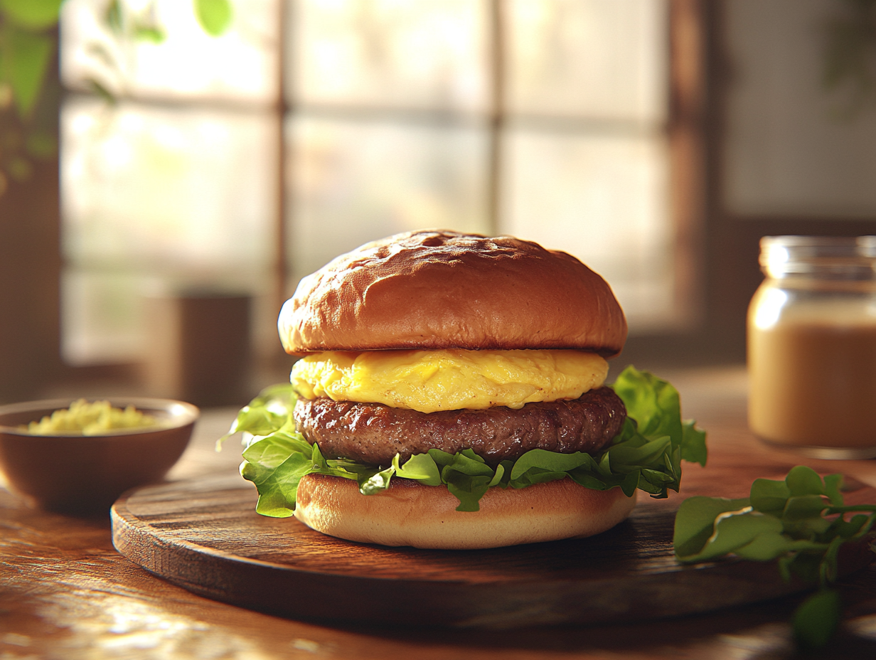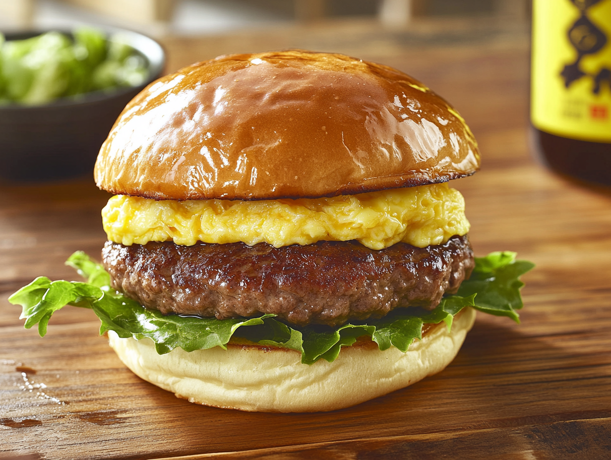 The choice of brioche buns enhances the overall experience, as their softness pairs well with both the egg and beef patty. Lightly toasting the buns ensures they hold up well against the burger’s rich textures while adding a subtle buttery note.