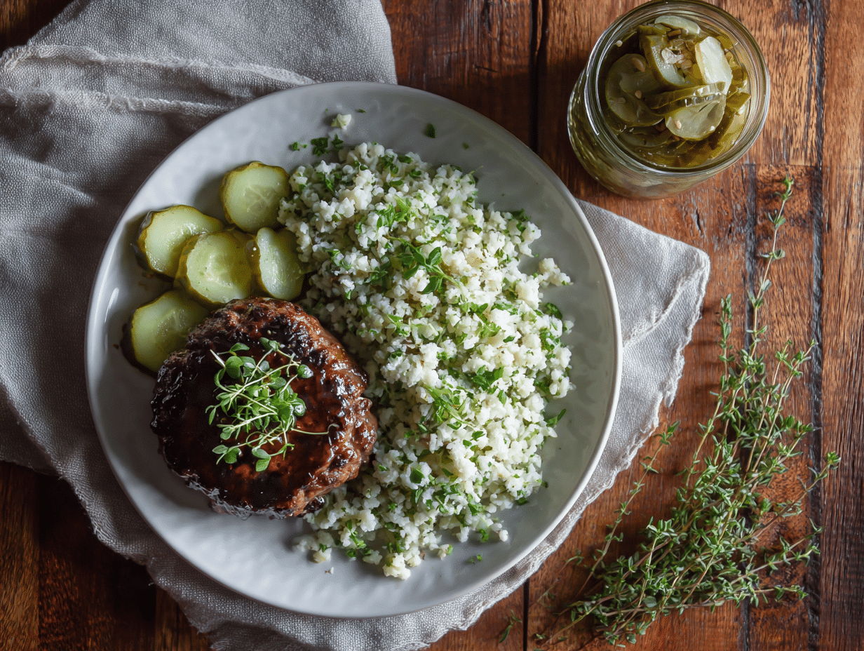 - Plate a generous scoop of cauliflower rice into a shallow bowl or plate. Top with a hamburger patty and a light sprinkle of parsley or microgreens for a refined finish.