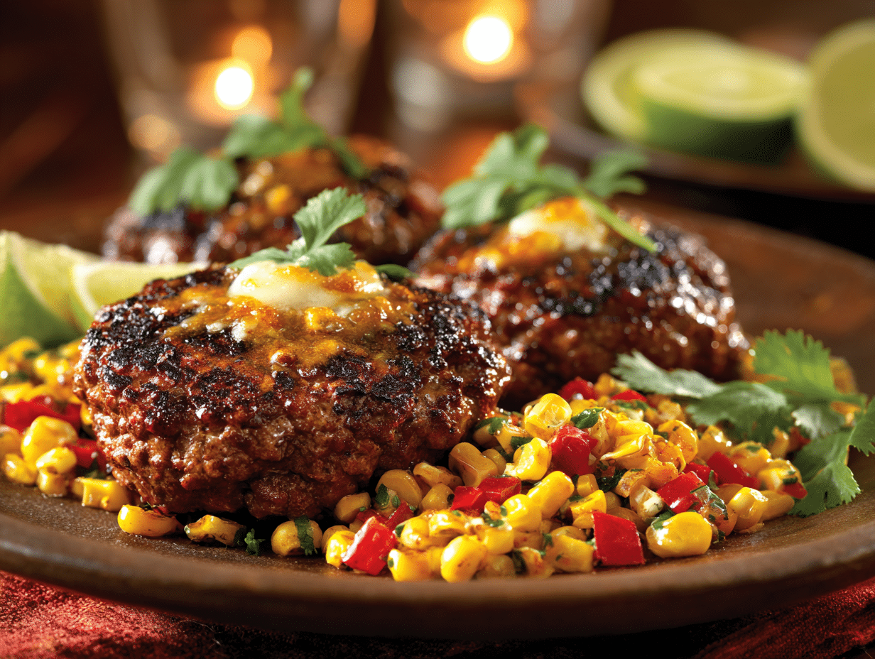 Of course, great food doesn’t just sit on a plate—it gathers its context from what’s around it. Enter the charred corn salsa. Many a meat-lover’s dish has faded into monotony because of a lack of textural and temperature contrast. Hot meat and melted cheese benefit from the freshness and bite of something cool and herby. The salsa plays that role beautifully. Fire-kissed corn kernels bring a smoky sweetness that echoes the chipotle in the patties, while roasted red peppers add body and color. Cilantro and freshly squeezed lime juice brighten the dish considerably, making each bite feel alive rather than heavy. This isn’t just a garnish—it’s a co-star. Together, the salsa and stuffed patties create a dish that is simultaneously rich and refreshing.