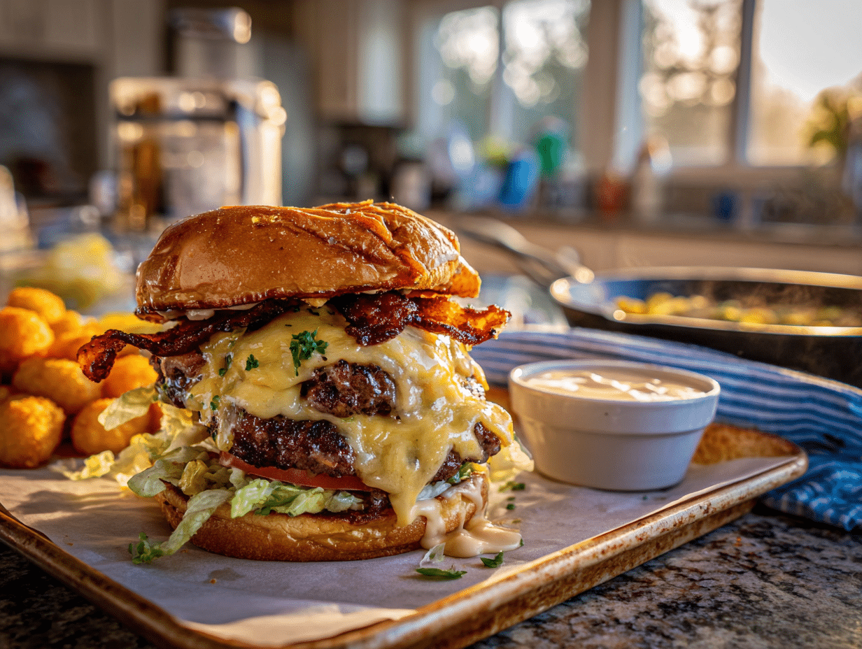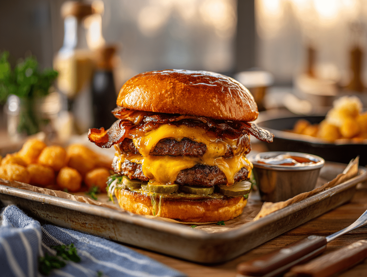 - Assemble (2–3 minutes): Spread a spoonful of sauce on each bottom bun. Layer 4 pickle chips, a little shredded iceberg, and a tomato slice (optional). Add one cheese-topped patty, 2 slices of crisp bacon, then a second cheese-topped patty. Cap with the garlic-buttered top bun. Press gently to set.