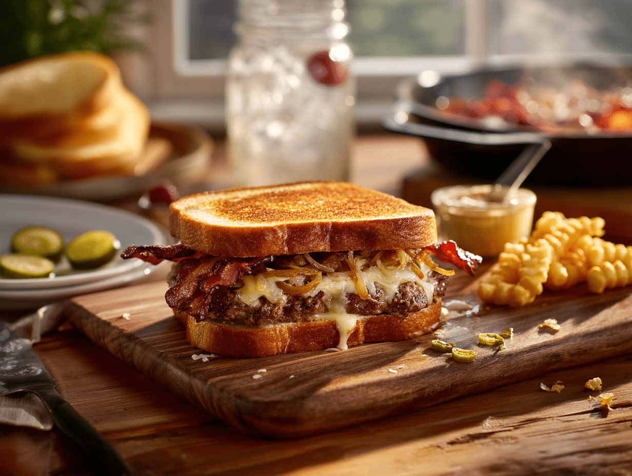 - Assemble the Bacon Melt: Spread a generous layer of melt sauce on the untoasted sides of 4 bread slices. Top each with a cheesy patty, a mound of caramelized onions, 2 bacon slices, and 2 dill pickle chips (plus jalapeño if using). Cap with the remaining bread (sauce side in). Press gently to set.