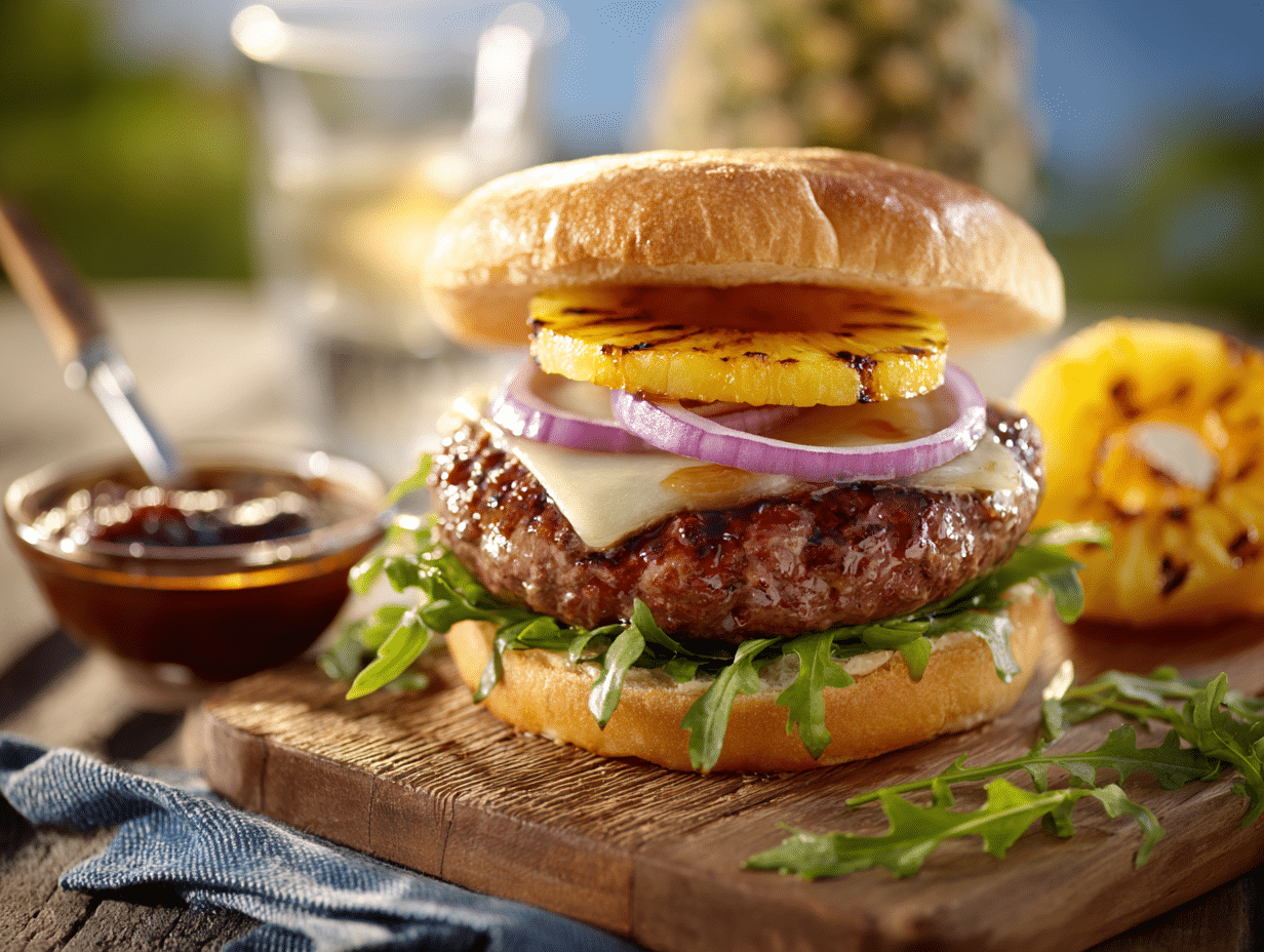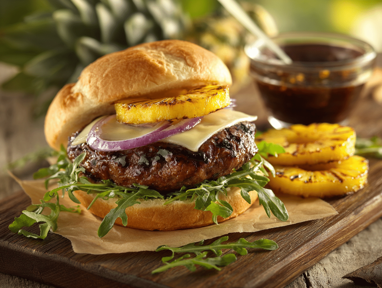 The story of this recipe begins with travel and inspiration. While visiting the Hawaiian islands and venturing through bustling island markets and beachside food trucks, I noticed a recurring culinary theme — the joyful collision of sweet fruit with rich, savory grilled meats. Nowhere is this more evident than in Hawaiian cuisine, where dishes like kalua pork with pineapple salsa or teriyaki-laden meats with fruity marinades highlight the culture’s gift for blending tropical flavors and time-tested cooking techniques. This burger recipe emerged from that inspiration — a gourmet twist on the beloved “Hawaiian burger,” infused with deeper umami and modern flair.