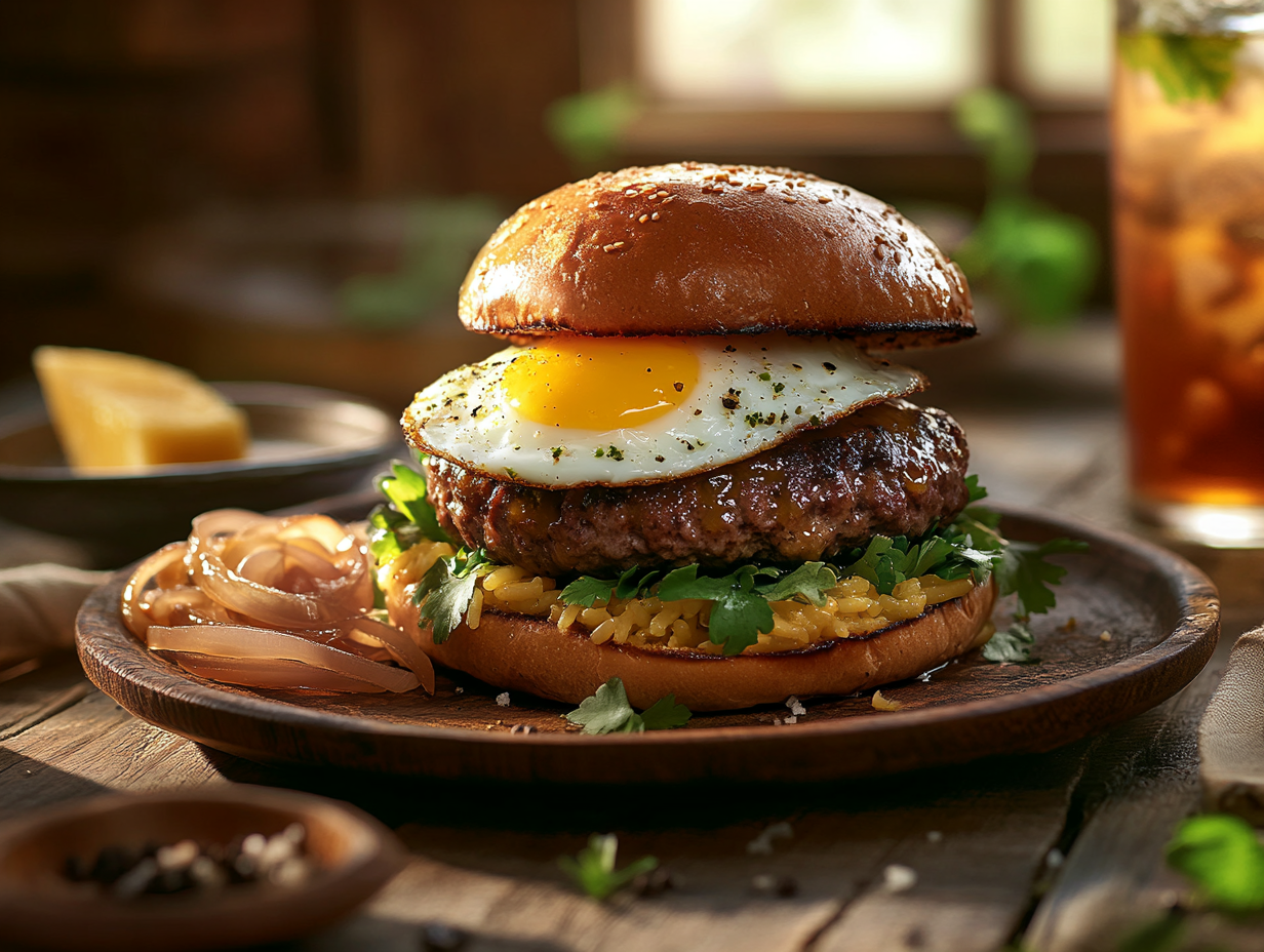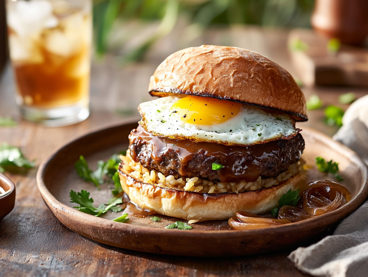 The pièce de résistance, of course, is the sunny-side-up egg perched atop the patty. Its runny yolk cascades over the burger when broken, adding a creamy richness that ties all the elements together. The dish’s genius lies in this symphony of textures: the soft rice, juicy meat, silky gravy, and oozing egg create a tactile balance that satisfies every bite.