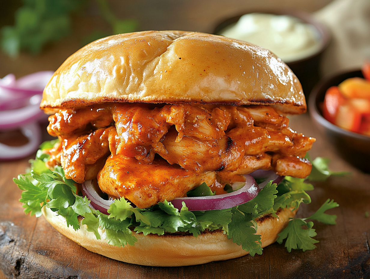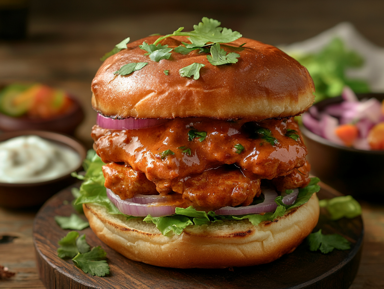 Butter chicken, or “murgh makhani,” is a signature dish of North Indian cuisine. Originating from Delhi in the 1940s, it was created by combining leftover Tandoori chicken with a rich, buttery tomato-based sauce to prevent it from drying out. Over the years, butter chicken has become one of the most recognized Indian dishes worldwide, appreciated for its balance of smoky, spicy, and creamy notes. The Indian Butter Chicken Burger reimagines this classic by turning its star flavors into a contemporary culinary treat that speaks to global audiences.
