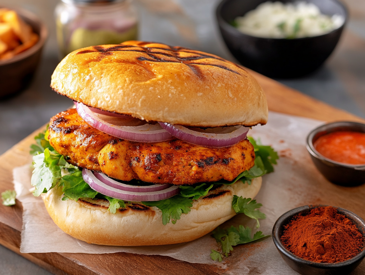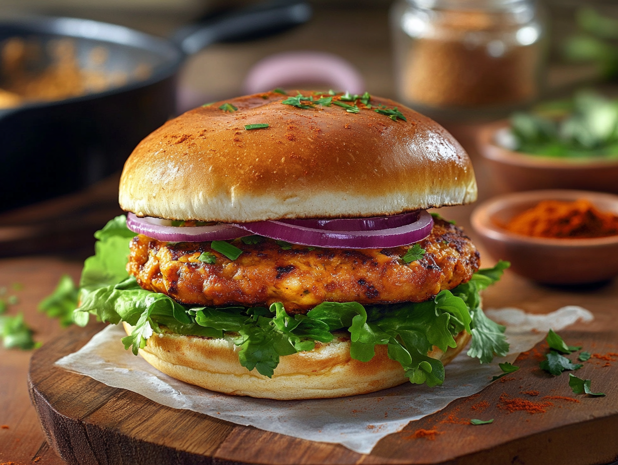What sets the Indian Butter Chicken Burger apart is its thoughtful construction and attention to detail. The chicken patties are carefully seasoned with classic Indian spices like garam masala, cumin, and turmeric, enhanced with the tanginess of yogurt and lemon juice. These elements echo the marination process of traditional Butter Chicken, ensuring that the burger remains faithful to its Indian culinary roots. Cooking the patties to a golden brown perfection brings out the depth of flavor and maintains a juicy, succulent texture.