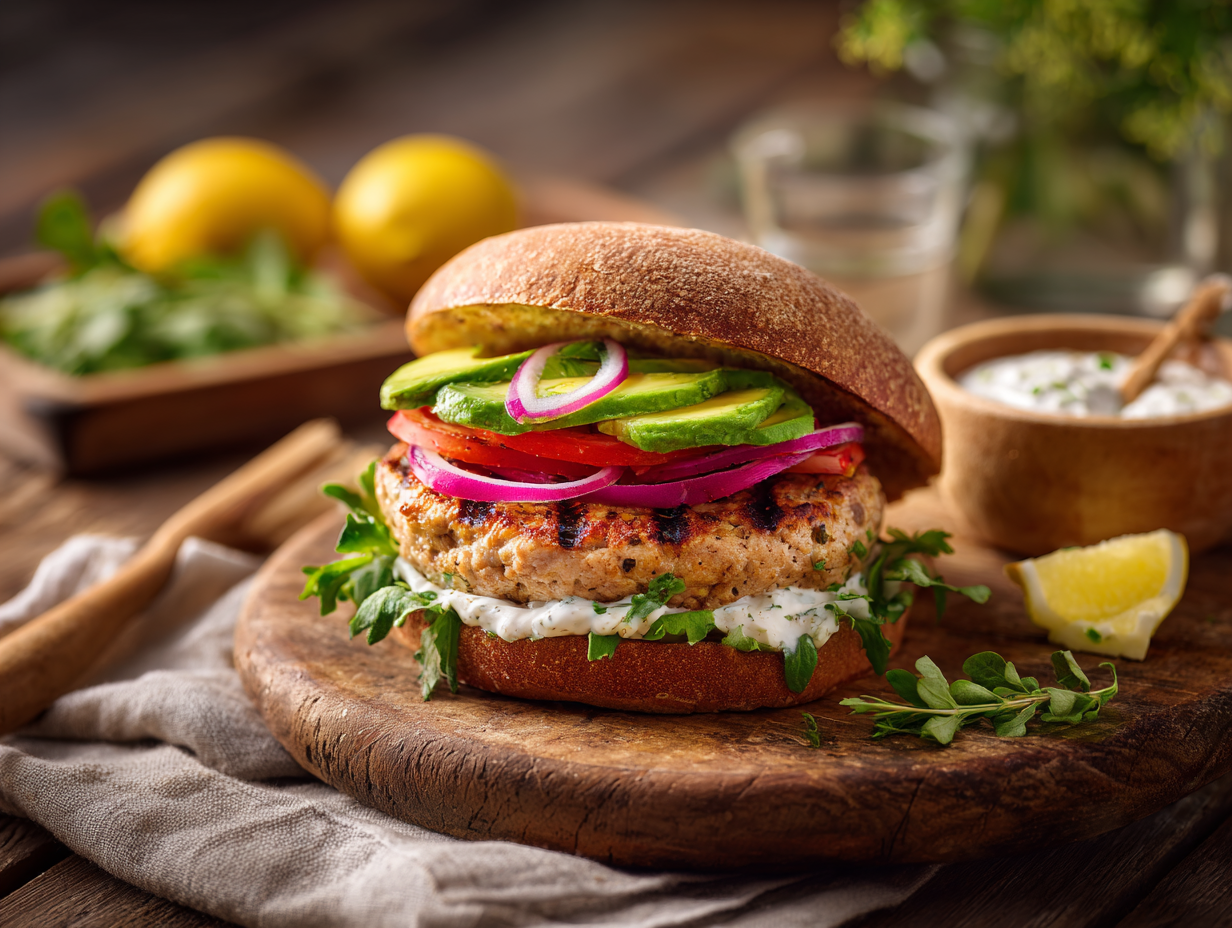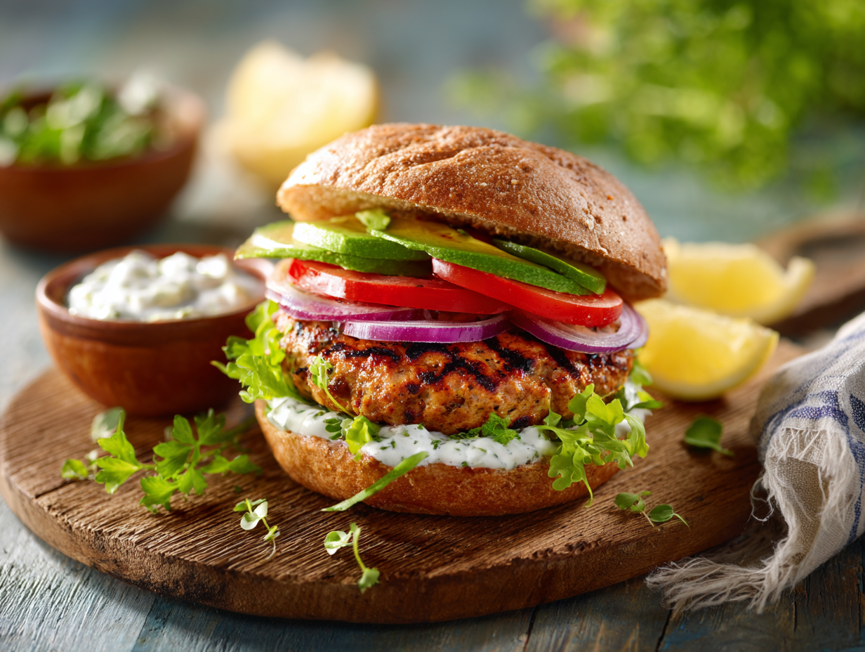 Condiments are often overlooked in burger discussions, but they can make or break a healthy option. Mayonnaise, while delicious, is high in calories and saturated fats. In this version, creamy plain non-fat Greek yogurt is used as the base for a tangy, refreshing sauce that complements the smoky flavor of the grilled turkey. Greek yogurt is probiotic-rich, high in protein, and low in fat—making it a must-have in a healthy pantry. Combined with Dijon mustard and fresh lemon juice, the sauce bridges rich and acidic notes while providing a cooling component.
