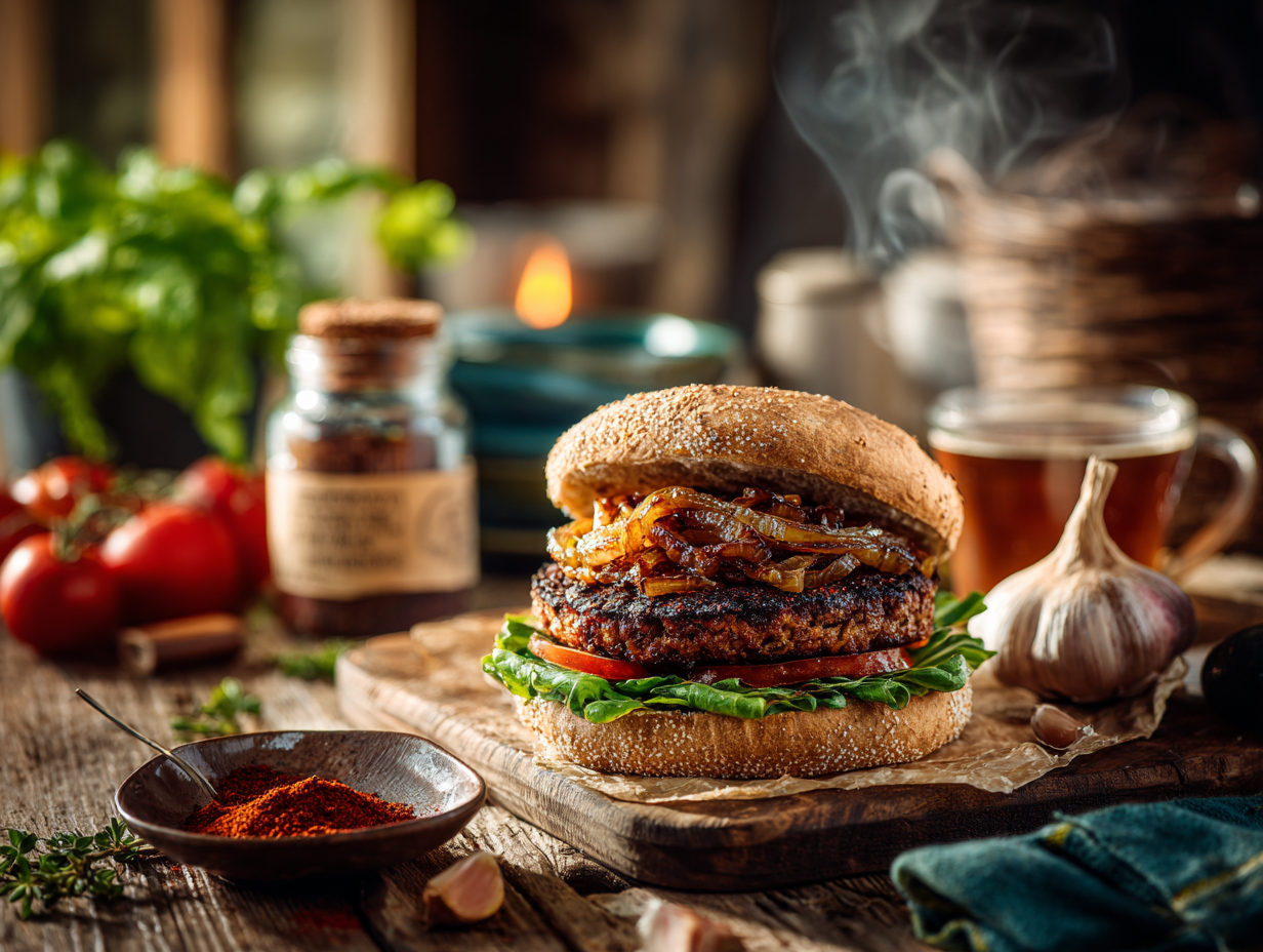The inspiration behind this burger was a typical summer BBQ—a time when smoky, grilled meats are the centerpiece of outdoor gatherings. To replicate that classic essence, smoked paprika (and optionally, a dash of liquid smoke) gives the patty that rich, barbecue-style flavor, evoking memories of burgers sizzling on the grill under blue skies. Even without fire or coals, this burger brings the smokiness of summer right into your kitchen.