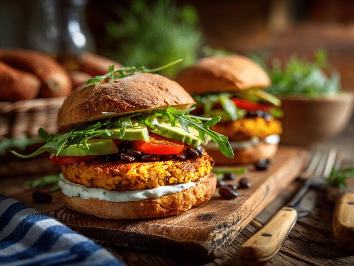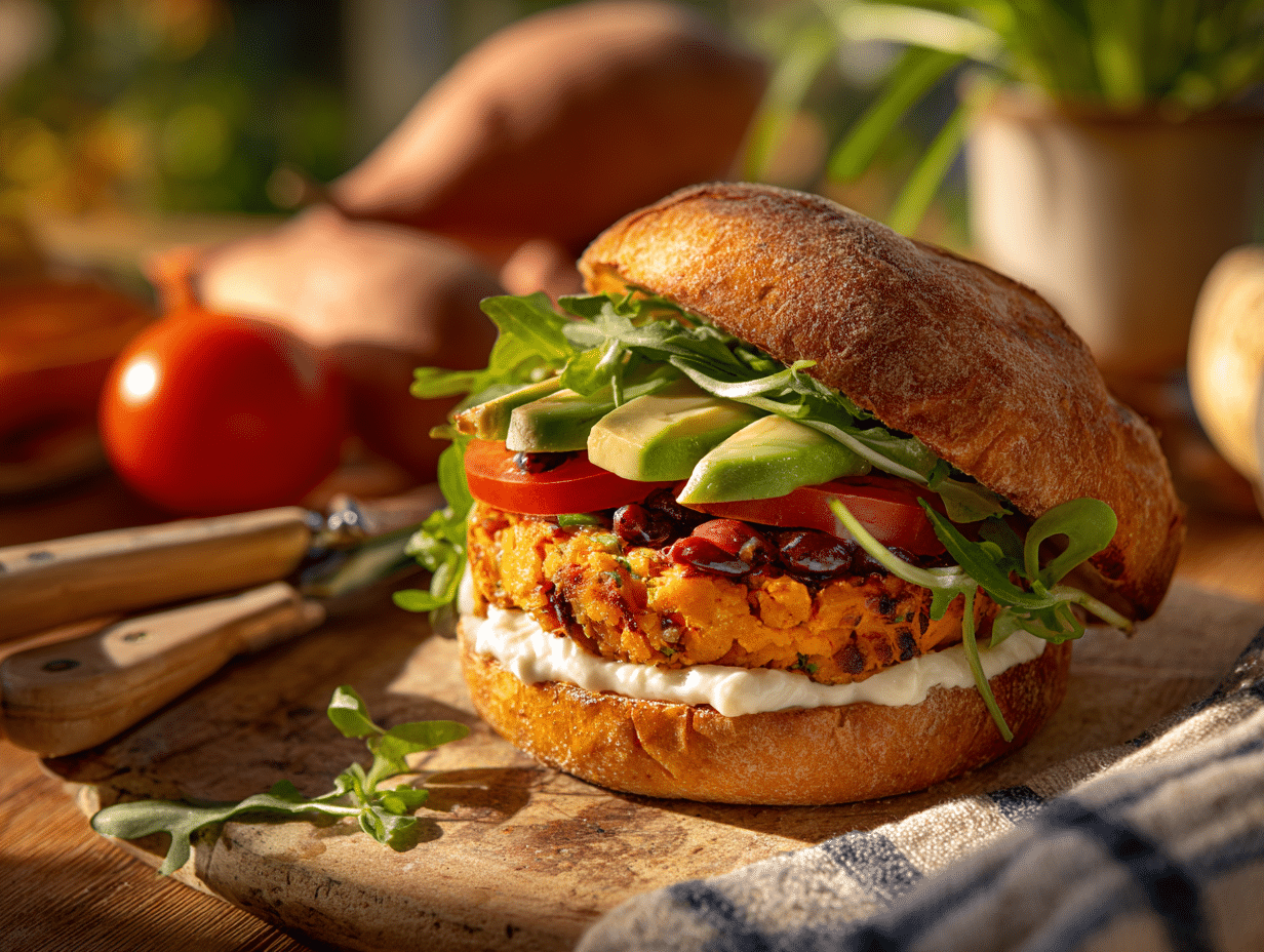 Spices and aromatics—like cumin, garlic, red onion, and smoked paprika—lend this burger its signature smoky, savory taste. Cumin and paprika give the patty a subtle depth, enhancing the natural sweetness of the sweet potatoes without overwhelming the dish. Garlic and red onion add classic savory notes, and together they create a flavor profile that feels warm, familiar, and deeply comforting.