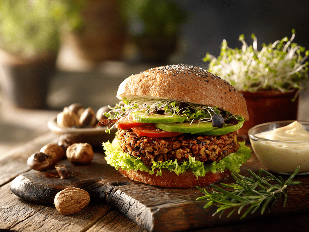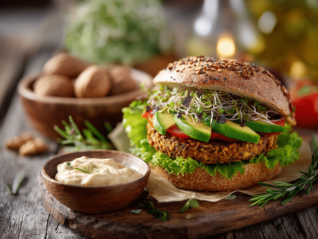 At the heart of this burger is the patty, composed of raw walnuts and earthy cremini mushrooms. Walnuts provide rich, plant-based omega-3 fats and a satisfyingly dense texture. When soaked, they blend easily into a hearty mixture without losing their crunch. The mushrooms contribute an umami punch that mimics the depth typically found in cooked meat-based burgers. Together, they offer a savory, nourishing base seasoned with garlic, tamari (or coconut aminos for a soy-free option), smoked paprika, flaxseed for binding, and a touch of sea salt. This blend is processed just enough to hold together without becoming a paste, maintaining a meat-like bite with layers of flavor.