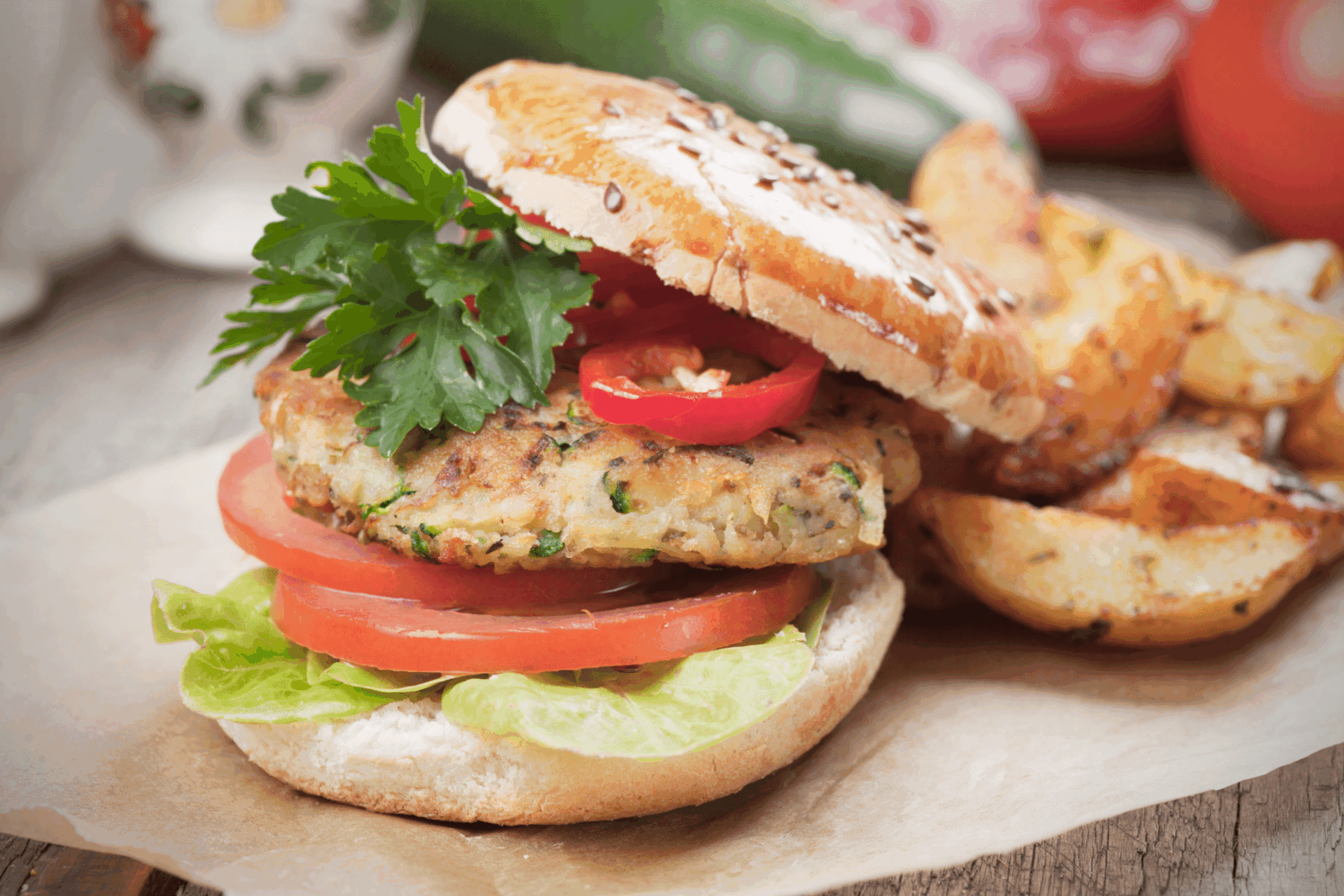 My hubby nick-named this burger the “hummus” burger because of the chickpeas, but the seasoning is versatile, so you could make this taste however you want. I topped ours with a homemade herbaceous green goddess dressing, lettuce, and tomato on a whole wheat bun. I will make these again and didn’t miss the meat at all!